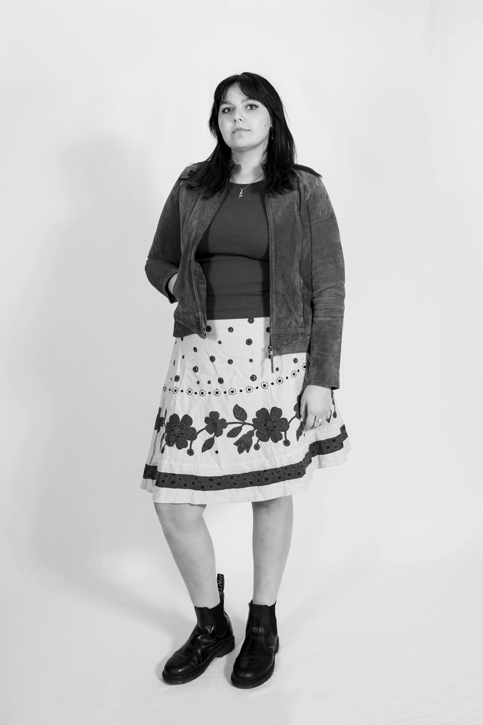 Raina Abbot poses for a fashion photoshoot in front of a gray backdrop in Moore Hall at Central Michigan University in Mount Pleasant, MI on Oct. 27. Abbot has many years of experience in modeling.